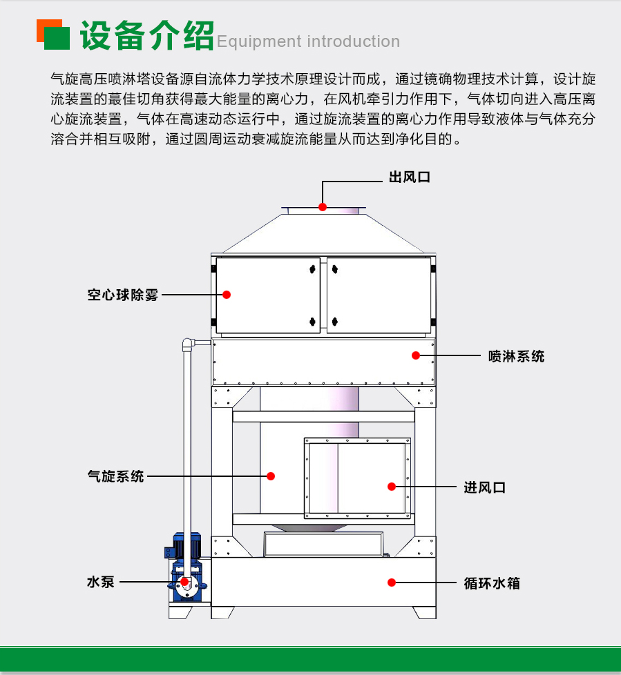 含塵含味氣體通過吸氣罩收集,在風機的作用下,經過管道輸送負壓進入雙級氣旋噴淋塔。氣旋混流裝置快速運轉,多級連續的凈化使得含塵含味氣體與水霧充份混合,在離心的作用下達到氣液分離。氣旋桶內部采用水泵循環給水,水在水箱經水泵增壓后自螺旋噴嘴霧化而出,最后回流至水箱循環使用。分離出來的雜物下沉到水箱底部,經凈化后的氣體進入填料隔水層,然后由風機排出。