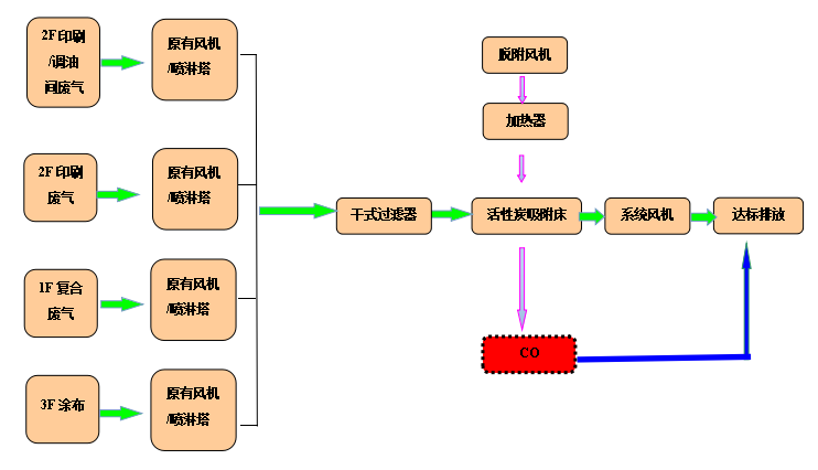 印刷排氣系統(tǒng)合并后處理,保持原有的噴淋塔,有機(jī)廢氣先通過干式過濾器進(jìn)行預(yù)處理,預(yù)處理后進(jìn)入活性炭吸附劑床進(jìn)行吸附,處理后的氣體可直接達(dá)標(biāo)排放。當(dāng)活性炭飽和后,利用加熱的空氣作為介質(zhì),將吸附在活性炭里的有機(jī)廢氣吹脫出來,經(jīng)循環(huán)后增濃,即濃縮成高濃度的廢氣后進(jìn)入催化燃燒裝置,在催化劑的作用下,于200-300℃時(shí)分解成無害化的CO2和H2O后達(dá)標(biāo)排放。