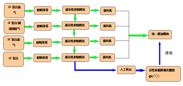 目前該公司在各車間根據(jù)不同的生產(chǎn)工藝分類收集廢氣匯入主風(fēng)管,主風(fēng)管接入指定廠房排風(fēng)井,經(jīng)風(fēng)井在離心風(fēng)機(jī)的牽引作用下引入屋面廢氣治理設(shè)施,對(duì)于低濃度廢氣采用的是水噴淋吸收法,對(duì)于高濃度廢氣采用的是水噴淋吸收+活性炭吸附法,該公司為響應(yīng)環(huán)保要求,擬對(duì)廢氣處理設(shè)施提標(biāo)改造。