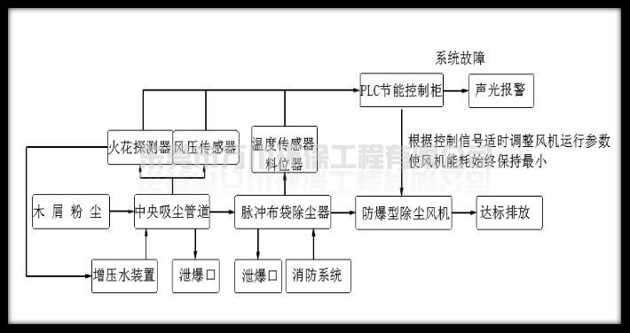 2)風機在除塵器末端,避免木料中的金屬物通過管道直接吸入風機中,將與風葉摩擦的火花吹進布袋除塵器中,導致安全隱患。